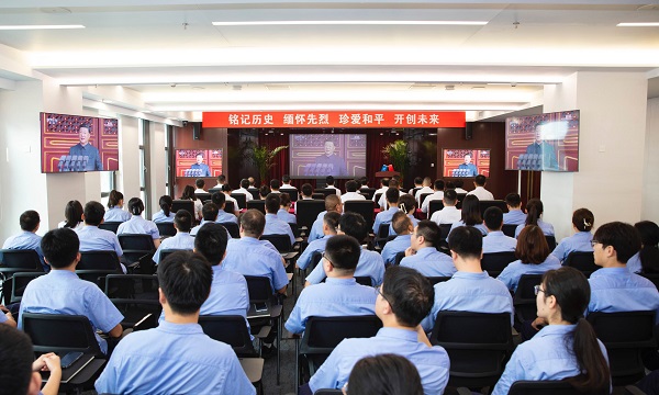 观看现场,党员干部员工全神贯注,跟随直播画面感受大会盛况。习近平总书记发表重要讲话,人民军队光荣接受习近平总书记检阅,空中梯队战机起飞,阅兵分列式正式开始。45个方(梯)队依次通过天安门广场,从空中护旗梯队用多型直升机编队传递“正义必胜、和平必胜、人民必胜”的真理,到徒步方队兼顾“抗战老部队”荣光与“军事力量新布局”朝气;从战旗方队擎起功勋旗帜传承抗战精神,到装备方队按实战化联合编组展示最新国产主战装备;再到空中梯队多机型编队展现空中作战实力,充分展示了中国人民解放军改革重塑后的军兵种结构崭新布局和武器装备体系建设的最新成果。人民英雄纪念碑前,千余名官兵组成的新中国阅兵史上规模最大的联合军乐团,演奏抗战经典曲目,14个排面象征十四年抗战,80名礼号手寓意胜利80周年。活动最后,8万只彩色气球与8万羽和平鸽同时腾空,致敬和平。